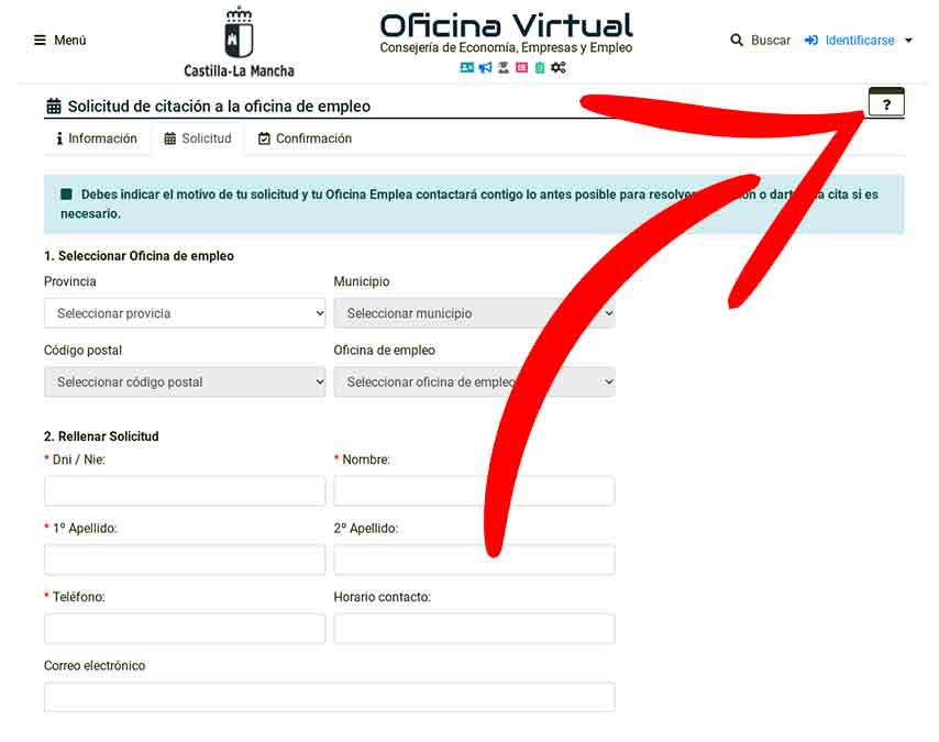 Después se abre una nueva pantalla en la que debes completar el cuestionario para formalizar la cita en las oficinas. Si durante el proceso tienes dudas o no sabes qué tienes que poner en alguno de los campos, puedes seleccionar el botón que aparece en la parte superior derecha que tiene forma de interrogación para que te ayuden. Para acceder a este servicio tienes que tener una cuenta creada en esta plataforma.