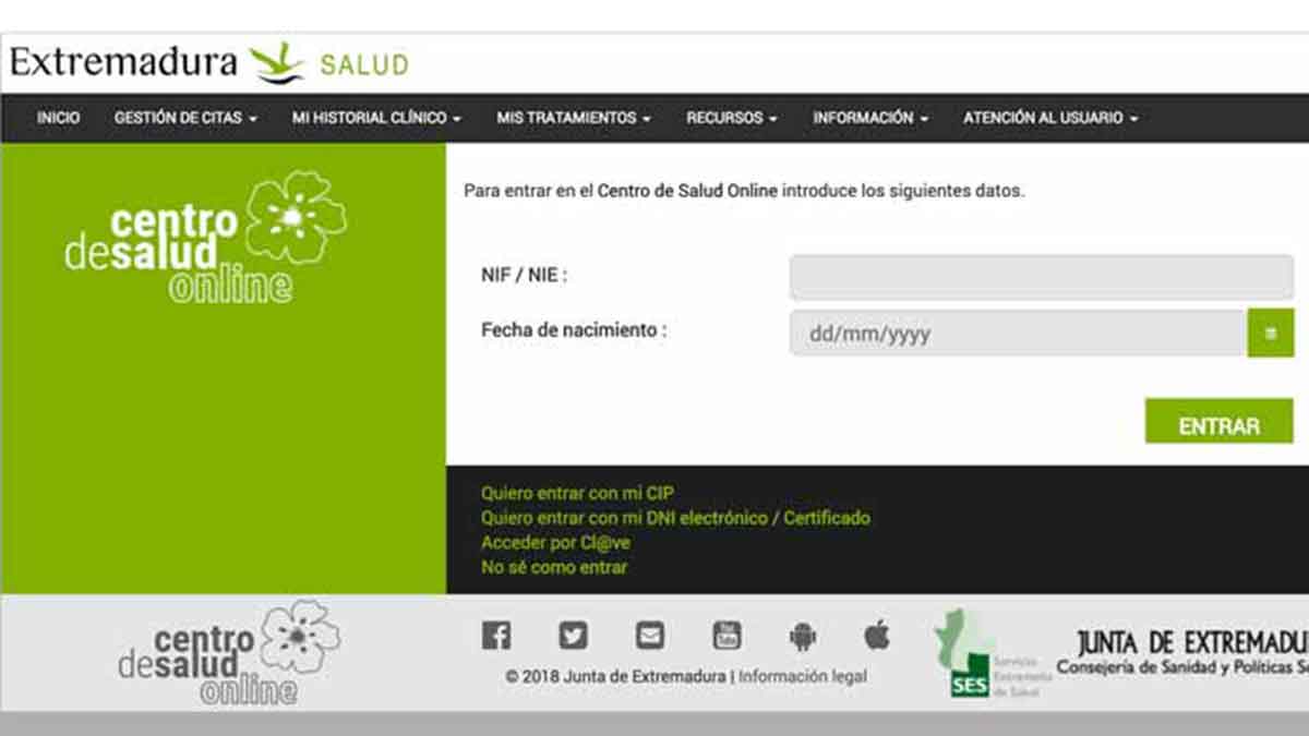 – Por Internet. El SES te da la opción de pedir tu cita médica por Internet mediante su nueva plataforma de Extremadura Salud. Aquí, con solo introducir tu DNI y tu fecha de nacimiento, podrás acceder a un panel completamente personalizado. En él podrás gestionar todas tus citas, modificarlas, anularlas o incluso visualizar tu historial clínico y las pautas de tu tratamiento. Con este nuevo sistema, el Servicio Extremeño de Salud pretende facilitar al máximo la vida a sus pacientes y que tengan a su alcance toda su información médica.