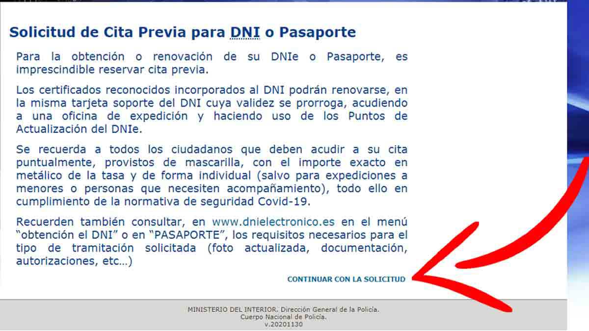 En esta página de inicio se informa a todos los usuarios que es obligatorio pedir la cita y hora para obtener o renovar tanto el DNI como el pasaporte. Para iniciar la gestión hay que seleccionar el botón que aparece abajo a la derecha que dice ‘Continuar con la solicitud’.