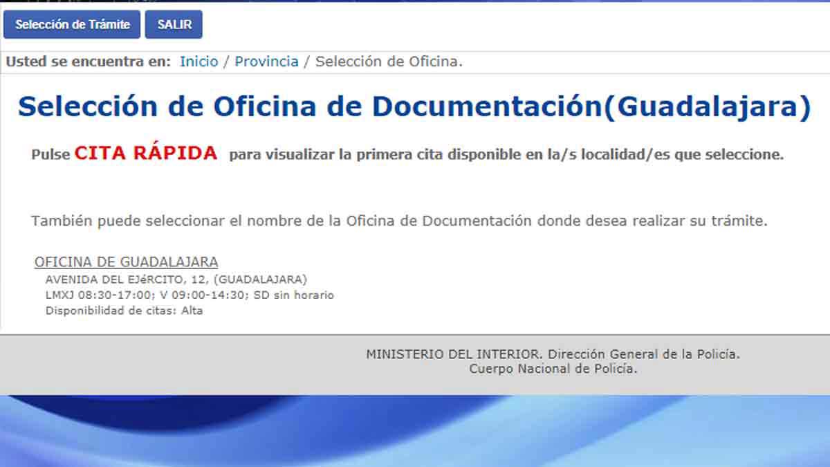 En la siguiente pantalla nos da la opción de seleccionar el botón que dice ‘Cita rápida’ en rojo para ver la primera cita disponible en la oficina de la provincia que hayamos seleccionado o seleccionar la oficina más abajo para concretar una hora y fecha distintas.