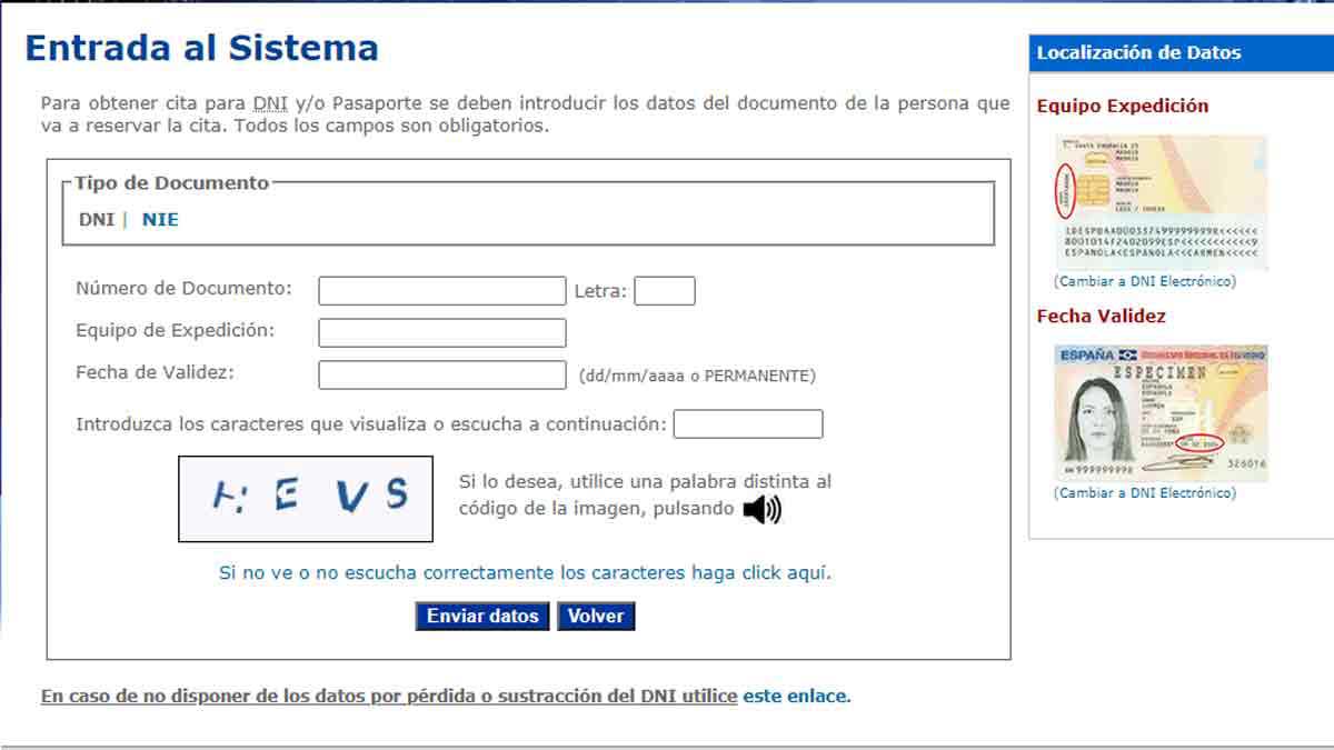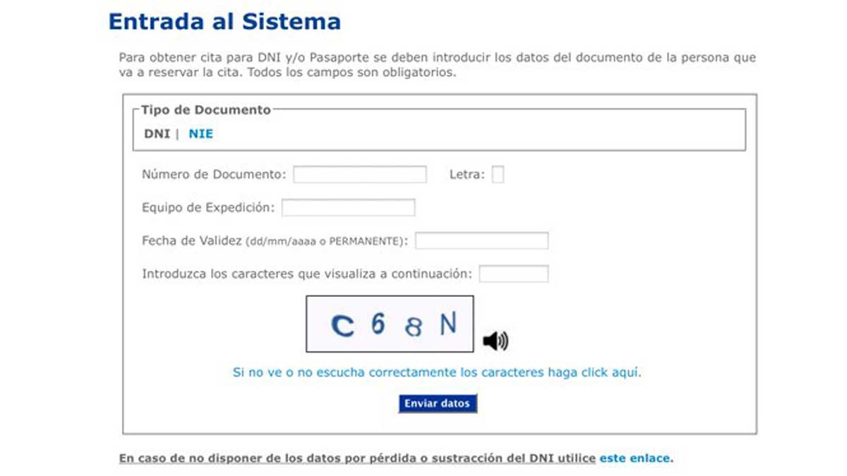En la web se informa de que si no dispones los datos por pérdida o por robo del DNI, selecciones el último enlace.