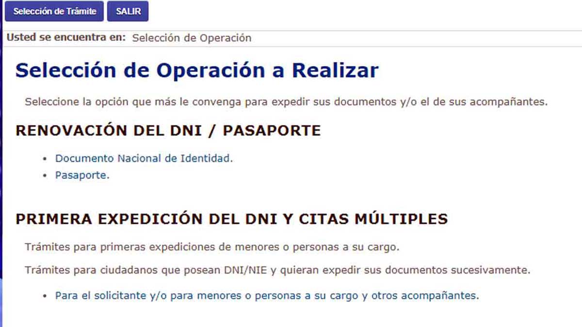 La siguiente pantalla que aparece nos pide que seleccionemos el tipo de trámite a realizar entre los siguientes: