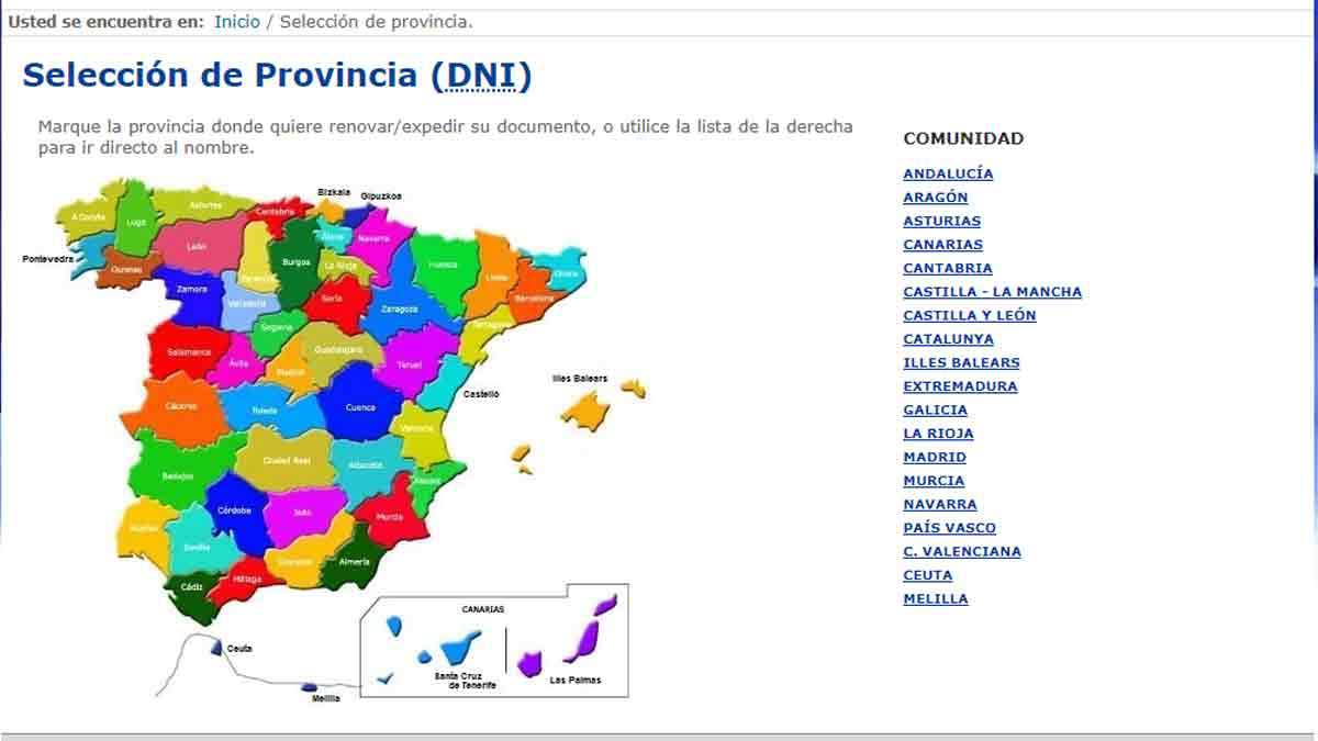 Si seleccionamos renovar el DNI, nos aparece un mapa de España con las distintas provincias en colores para que señalemos nuestro lugar de residencia y filtrar las oficinas. Primero seleccionamos la Comunidad Autónoma y después la provincia.