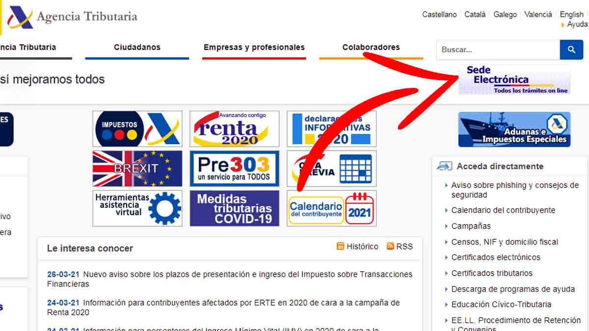 Para iniciar el trámite tienes que acceder a la web oficial de la Agencia Tributaria y acceder a la sede electrónica a través del botón que aparece en la parte superior derecha de la pantalla.