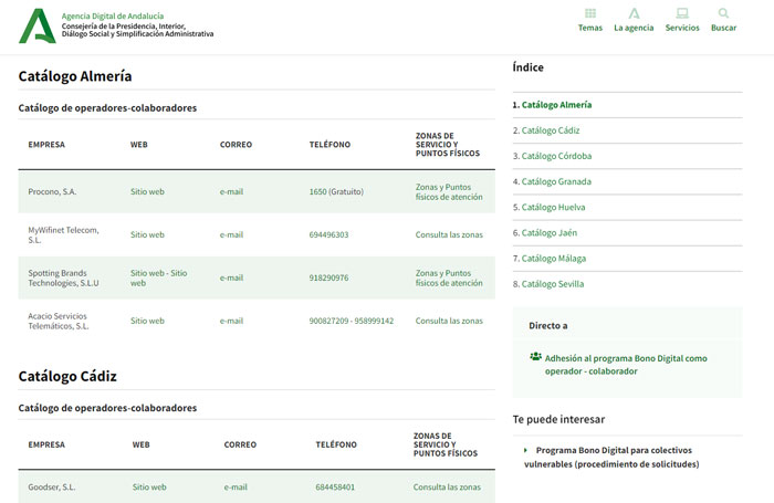 - Desde esta otra web, podrás consultar el catálogo de operadores colaboradores del Bono Digital. Para poder beneficiarte de la ayuda deberás tener un contrato con alguno de los operadores de la lista. Ahí podrás encontrar el catálogo para cada provincia de Andalucía.