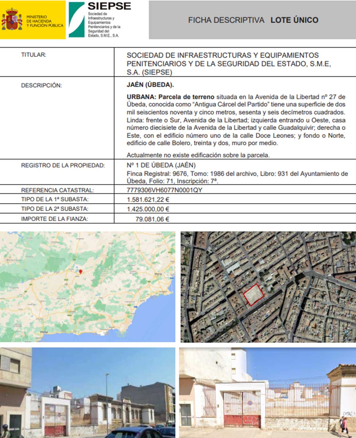 - Hasta los lotes más caros, como es la parcela de un terreno ubicado en Úbeda, Jaén, conocido como la ‘Antigua cárcel de partido’ que sale a subasta por 1.581.000 euros.