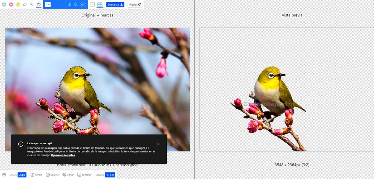 Hecho esto, puedes descargar la fotografía desde el botón azul que aparece en la parte superior de la pantalla. La única desventaja es que se descarga en un formato pequeño al original. Puedes acceder a esta web desde Clippingmagic.