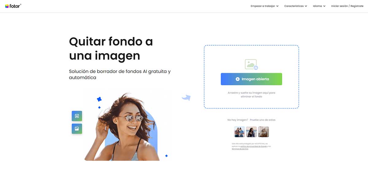 El proceso para quitarle el fondo a una fotografía en la herramienta Fotor es idéntico a los anteriores. Una vez en la página principal de la web, hay que seleccionar la fotografía que quieres subir para quitarle el fondo.