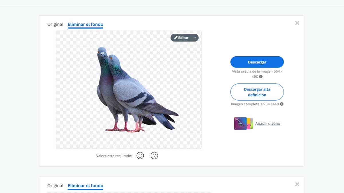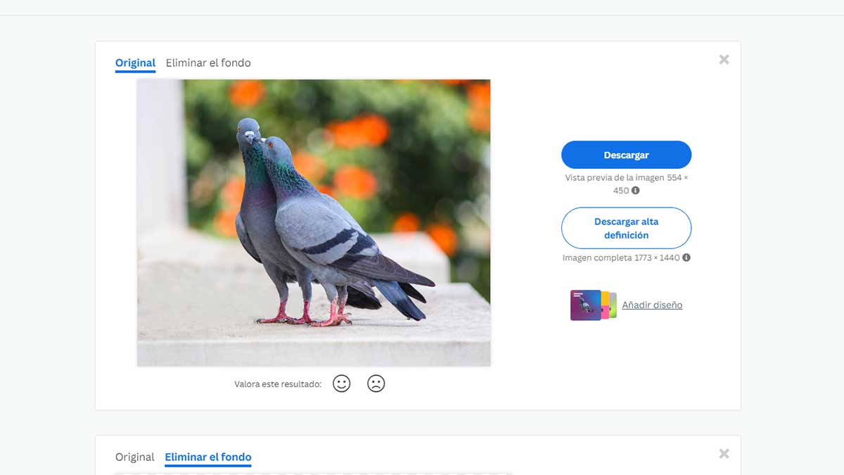 Hecho esto, tal y como puedes ver a continuación, aparece una ventana con la imagen en formato original y la versión sin fondo. Puedes ver las dos imágenes al pulsar la pestaña que dice ‘Original’ o ‘Eliminar el fondo’.