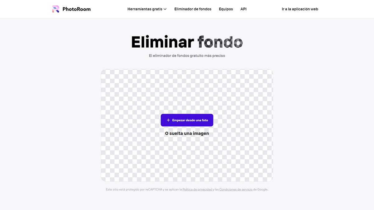 Photoroom es otra de las herramientas online gratuitas en las que puedes hacer desaparecer el fondo de tus imágenes en cuestión de minutos y de la manera más sencilla. Para empezar, hay que acceder a la página web y, desde el botón azul que aparece en el centro de la pantalla que dice ‘Subir la imagen’ que quieres editar.