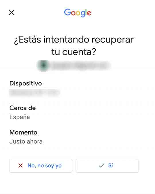 Si eres el propietario y la recibes, tienes que abrir la notificación en tu móvil. Al abrirla verás que Gmail te pregunta si estás intentando recuperar tu cuenta. Si es así, tienes que darle al botón ‘Sí’.