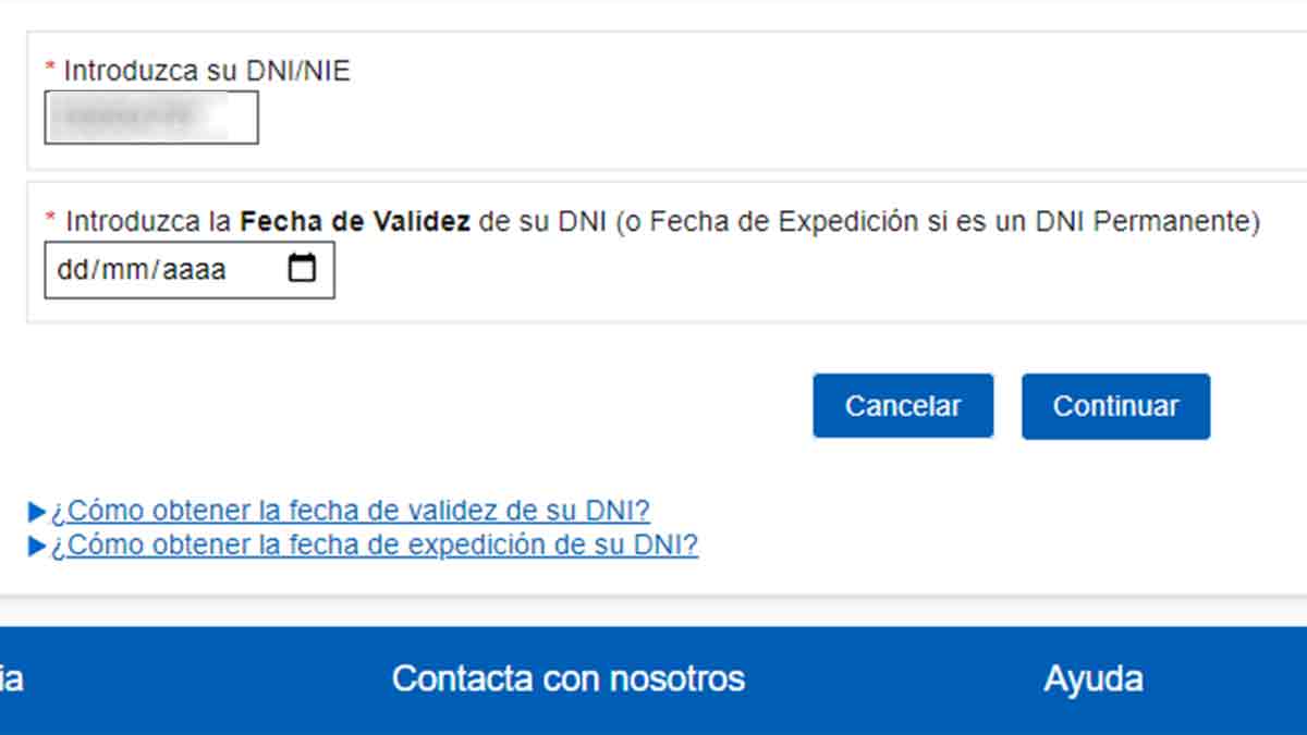 Tras introducir el número de DNI, aparece de forma automática un nuevo apartado en el que hay que introducir la fecha de validez del DNI indicado previamente.