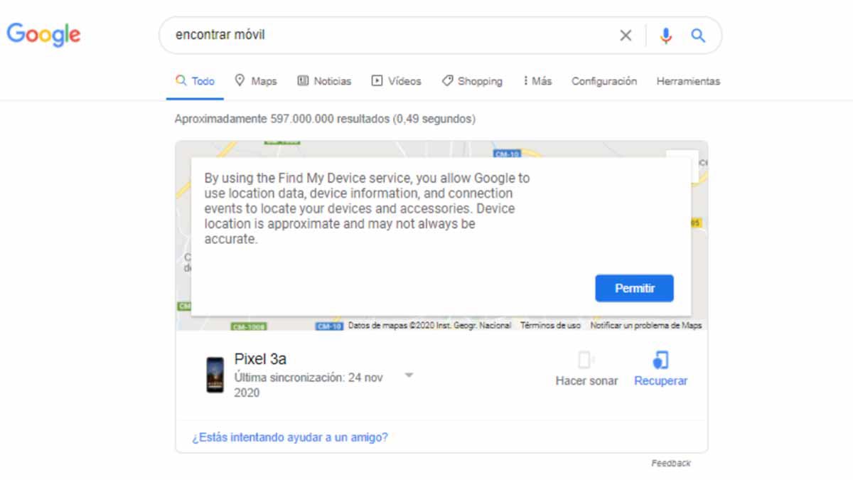 Otra manera de buscarlo es introduciendo en la barra buscadora de Google ‘Dónde está mi móvil’ y automáticamente, aparecerá. Un dato muy importante que debes valorar es que si al momento de realizar la búsqueda, el equipo no se encuentra conectado a Internet, éste aparecerá con la última ubicación que se registró en el momento de haber tenido una conexión.