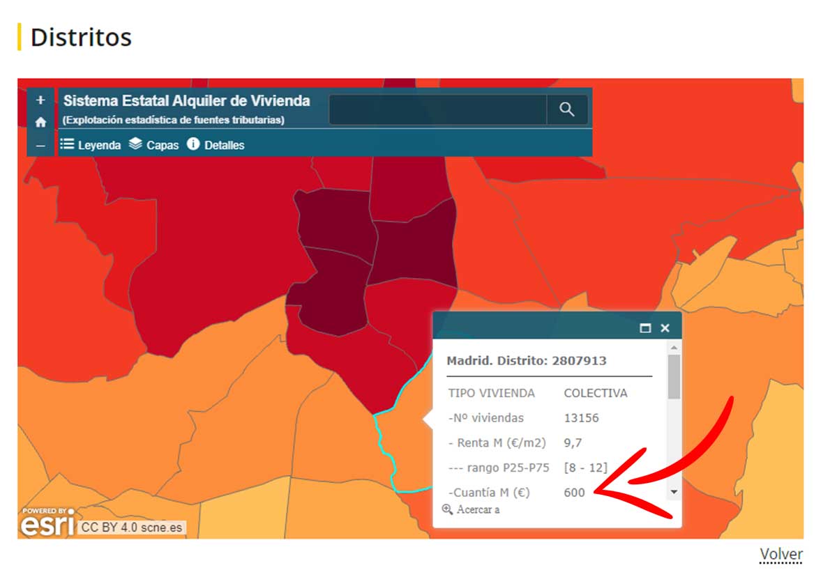 En las zonas de color más claro, como la que se muestra a continuación, el precio es más barato. En el ejemplo que puedes ver a continuación aparece detallada que lo que se paga es de 600 euros al mes de media por el alquiler de una vivienda.