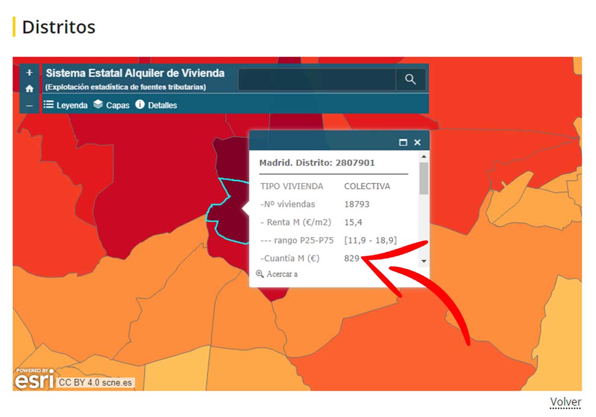 Por ejemplo, al pulsar en uno de los distritos delimitados, aparece el número de distritos en una ventana emergente, así como el número de viviendas disponibles en la zona. También se indica la renta media y la cuantía que se paga al mes en euros. En este caso, la cantidad a pagar es de 829 euros en esta zona.