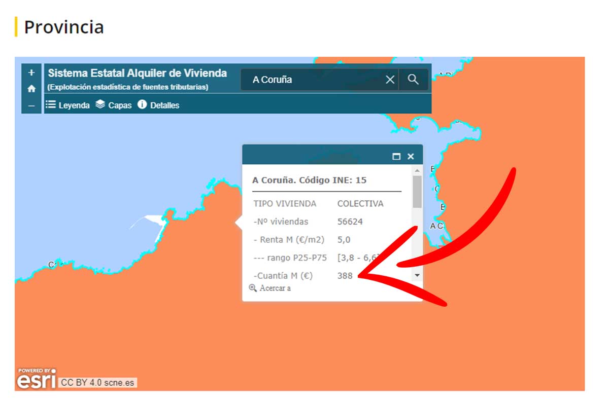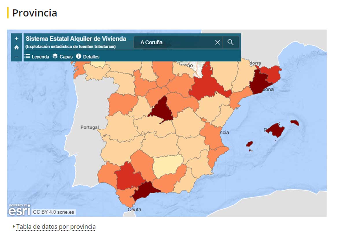 El proceso para consultar el precio del alquiler por provincias o por comunidad autónoma es el mismo. En el caso de las provincias, si seleccionamos, por ejemplo, A Coruña, aparece la siguiente información.