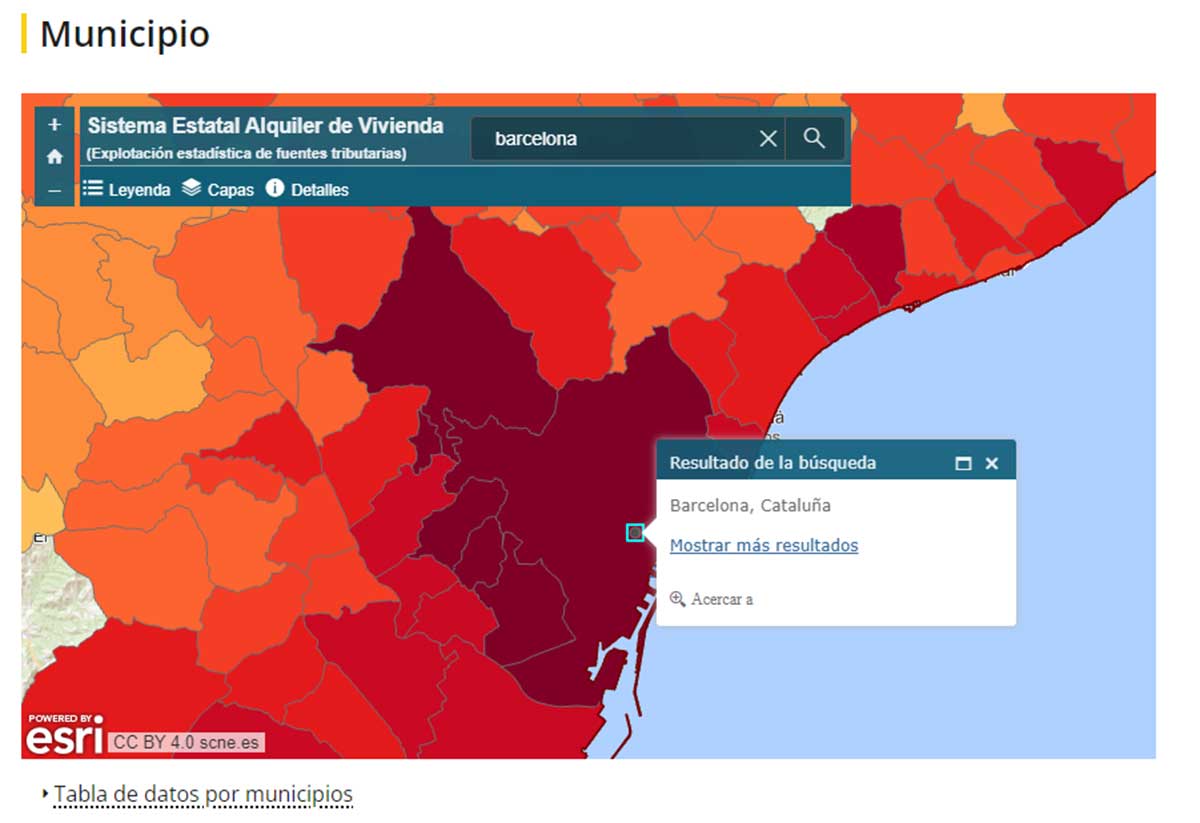 En el caso de querer hacer la búsqueda por municipio, el proceso es el mismo. Hay que seleccionar en el mapa un municipio específico y darle a la lupa. En este caso, ponemos el ejemplo de la ciudad de Barcelona.
