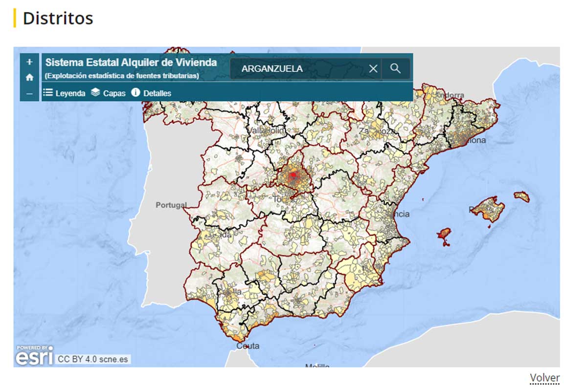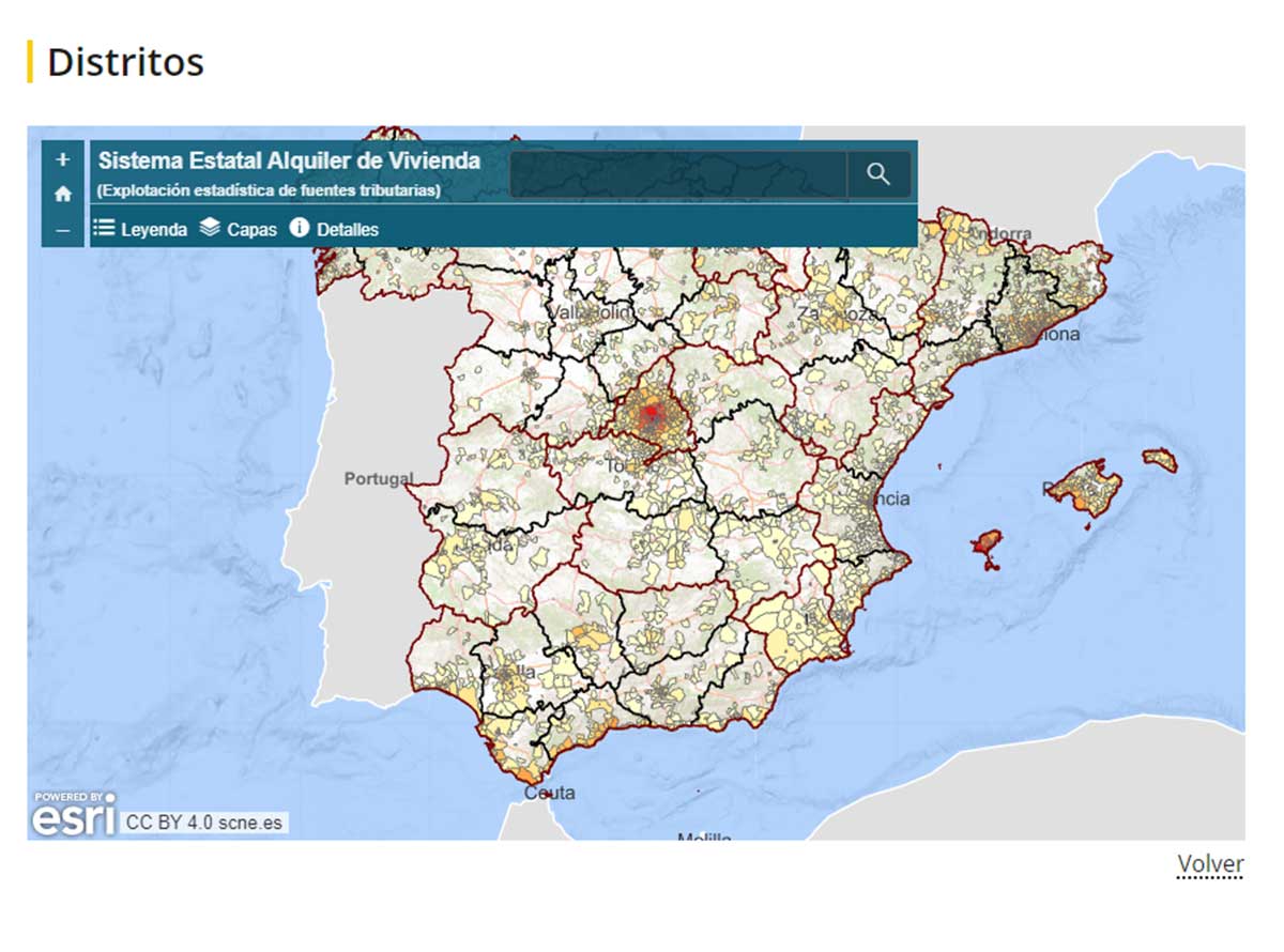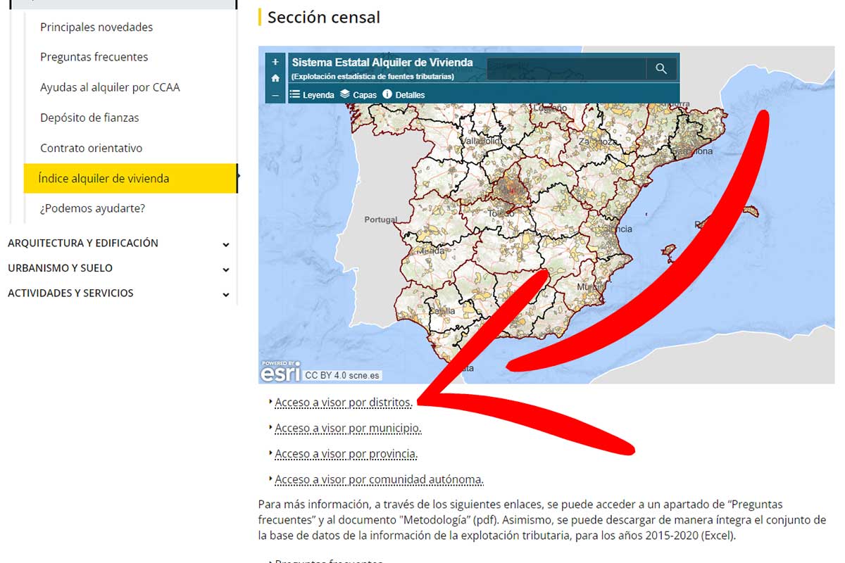 Para consultar el precio medio del alquiler en cualquier barrio o distrito de España hay que acceder a la web específica del Ministerio de Vivienda y pulsar en el botón que aparece debajo del mapa que dice ‘Acceso a visor por distritos’.