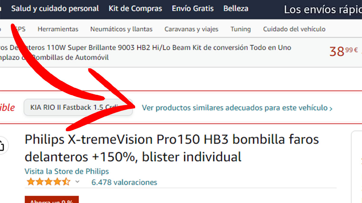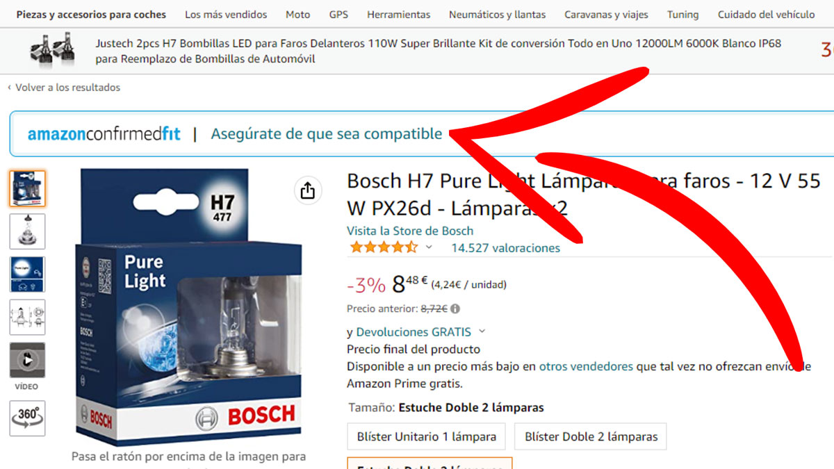 Desde la página de compra de productos de Amazon puedes verificar qué bombilla es compatible con tu coche. Para ello, primero tienes que acceder a la oferta del producto que quieres adquirir, en este caso un juego de bombillas para el coche. Una vez dentro del producto, arriba de la imagen y descripción, hay un recuadro que dice ‘amazonconfirmedfit’.