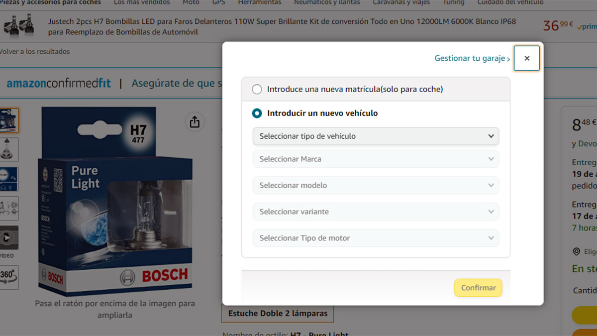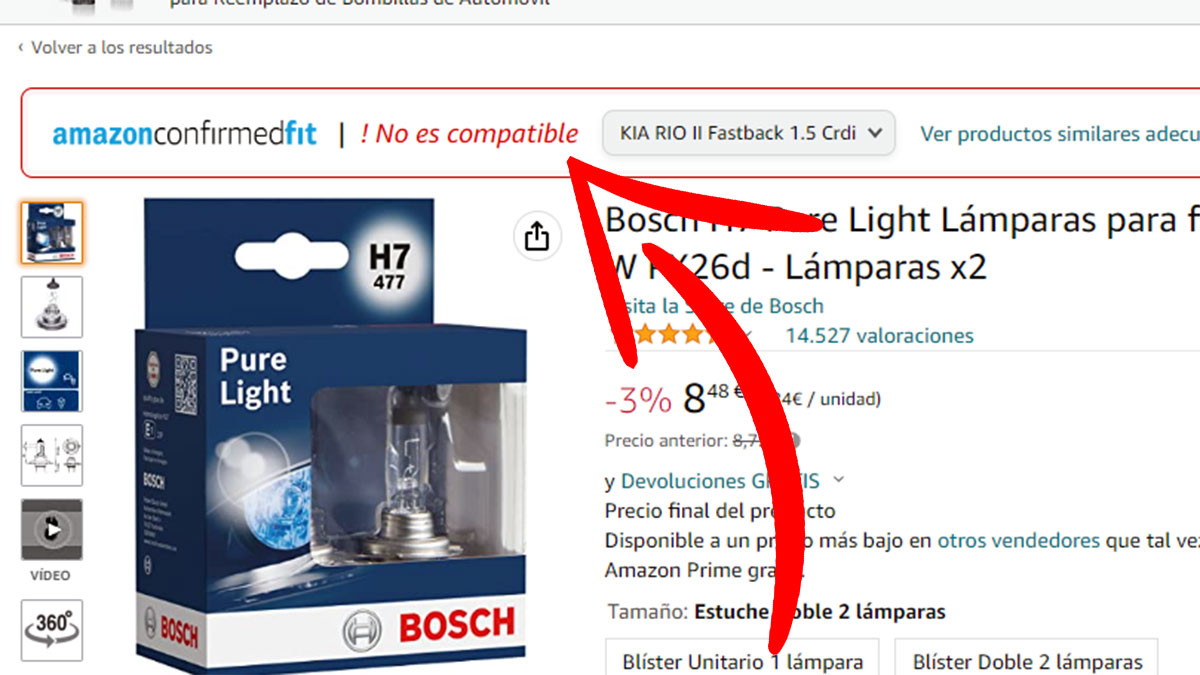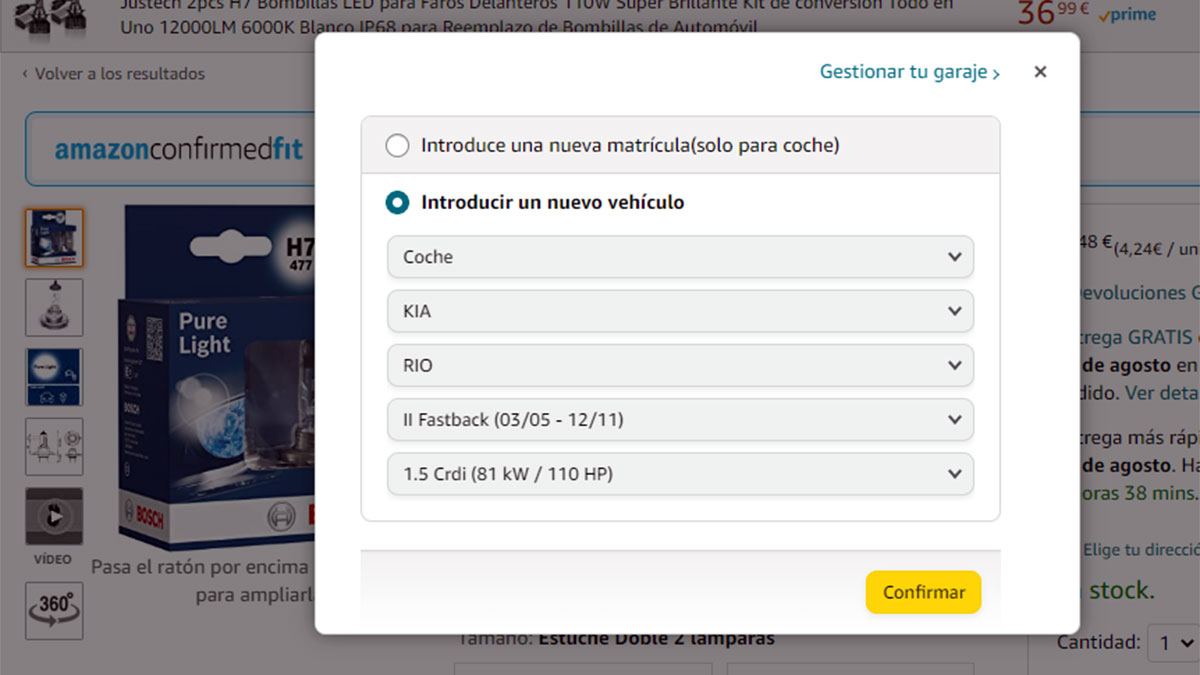 Al pulsarlo, aparece una ventana emergente en la que tienes que indicar el tipo de coche que tienes. De esta manera, Amazon puede indicarte qué tipo de bombillas puedes instalar en el vehículo. En este paso tienes que indicar la marca, modelo, variante y tipo de motor del coche. Para este ejemplo, hemos seleccionado un coche Kia Rio y la bombilla de la marca Bosch H7.
