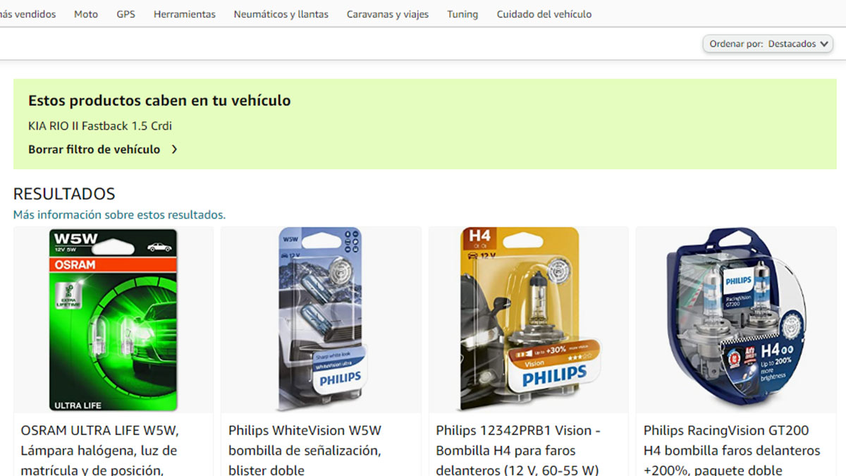 A continuación se abre una nueva página en la que aparecen solo productos compatibles con el coche indicado.