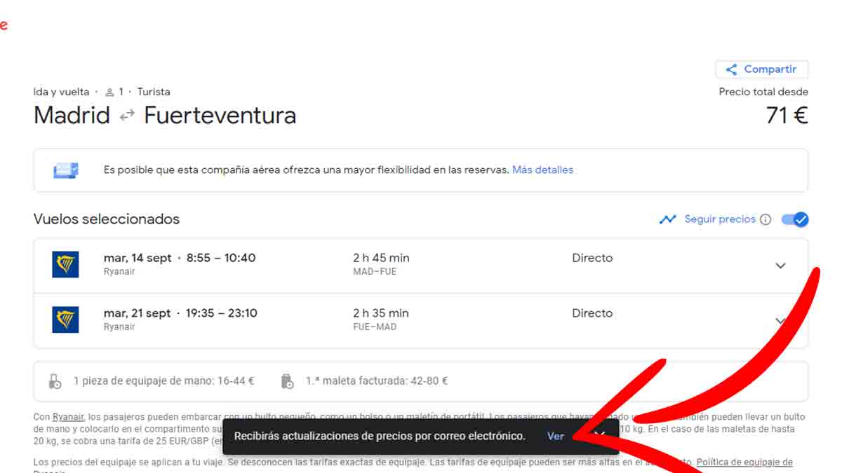 Al darle a este botón, aparece en la parte inferior de la página una notificación en la que tienes que seleccionar ‘Ver’. Se abre una nueva página en la que puedes ver los precios de vuelos que sigues, así como su historial.