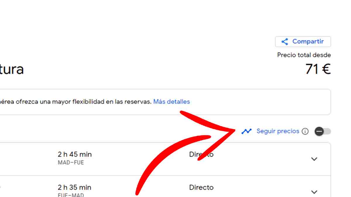 Google Flights tiene un sistema de alertas que te permite seguir los precios de una búsqueda concreta. De esta manera, puedes recibir una notificación al correo si el billete que quieres comprar baja de precio. Para activar estas alertas solamente tienes que hacer una búsqueda de un vuelo concreto en Google Flights y en la pantalla donde aparece el precio final, buscar en la parte superior la pestaña ‘Seguir precios’.