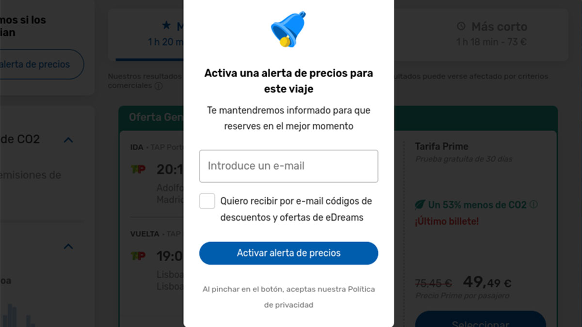 EDreams también ofrece esta posibilidad. El procedimiento es idéntico a todas las páginas que hemos explicado. Solamente tienes que introducir las características del billete que quieres buscar y seleccionar la pestaña ‘Activar alerta de precios’. Este botón se encuentra en la parte superior izquierda de la pantalla.