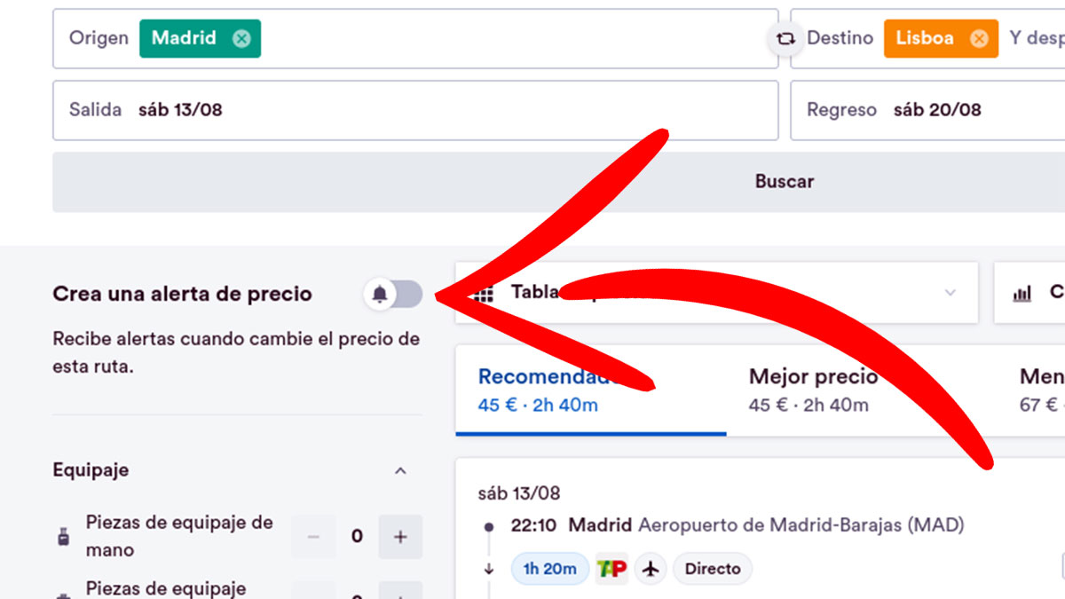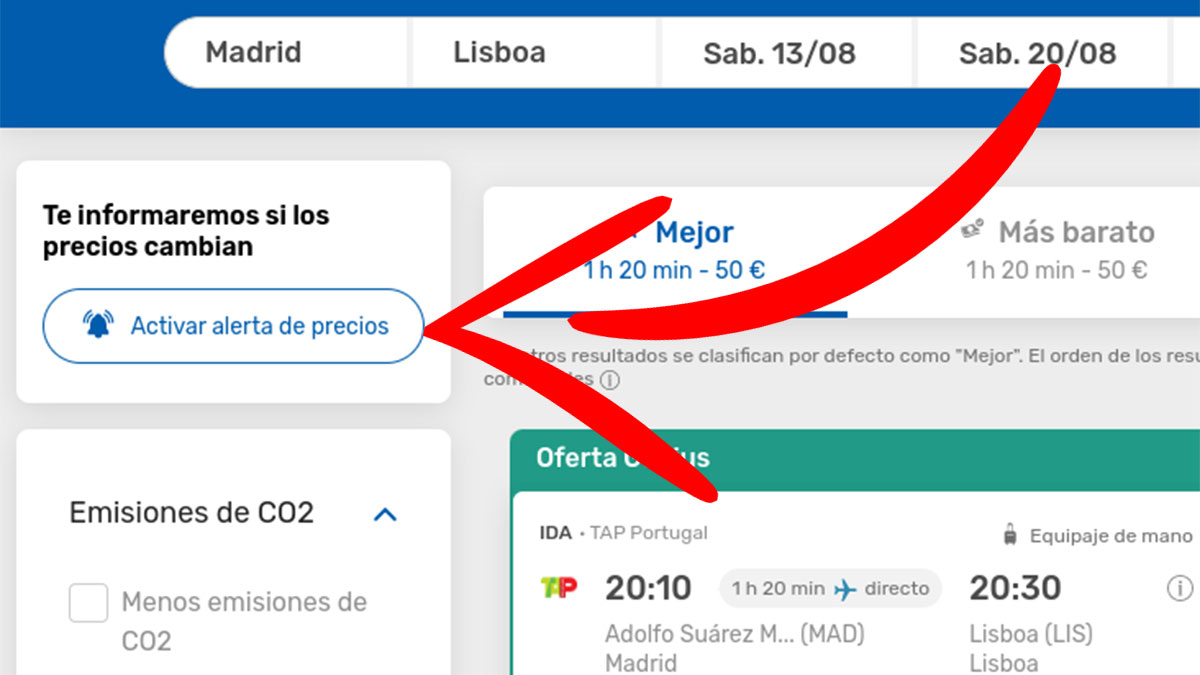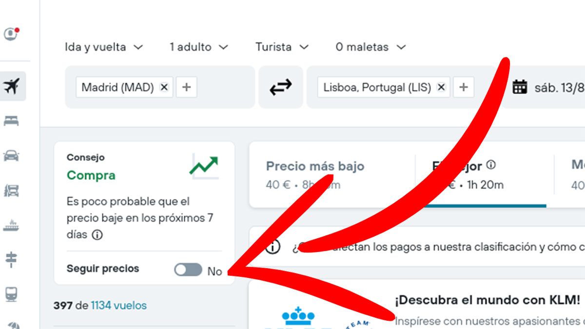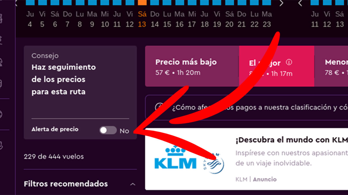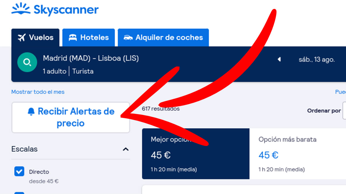 En este buscador de vuelos también puedes activar el sistema de alertas para que te avisen cada vez que el billete que quieres comprar baje de precio. Para activarlo y estar al día solamente tienes que acceder a la página del buscador e introducir los datos de búsqueda de tu vuelo. Añade un lugar de origen y un destino, así como la fecha de tu viaje. A continuación, en la página que se abre donde aparecen todas las ofertas de precio y distintos billetes, tienes que buscar el botón que dice ‘Recibir alertas de precio’. Este se encuentra en la parte superior izquierda de la pantalla.