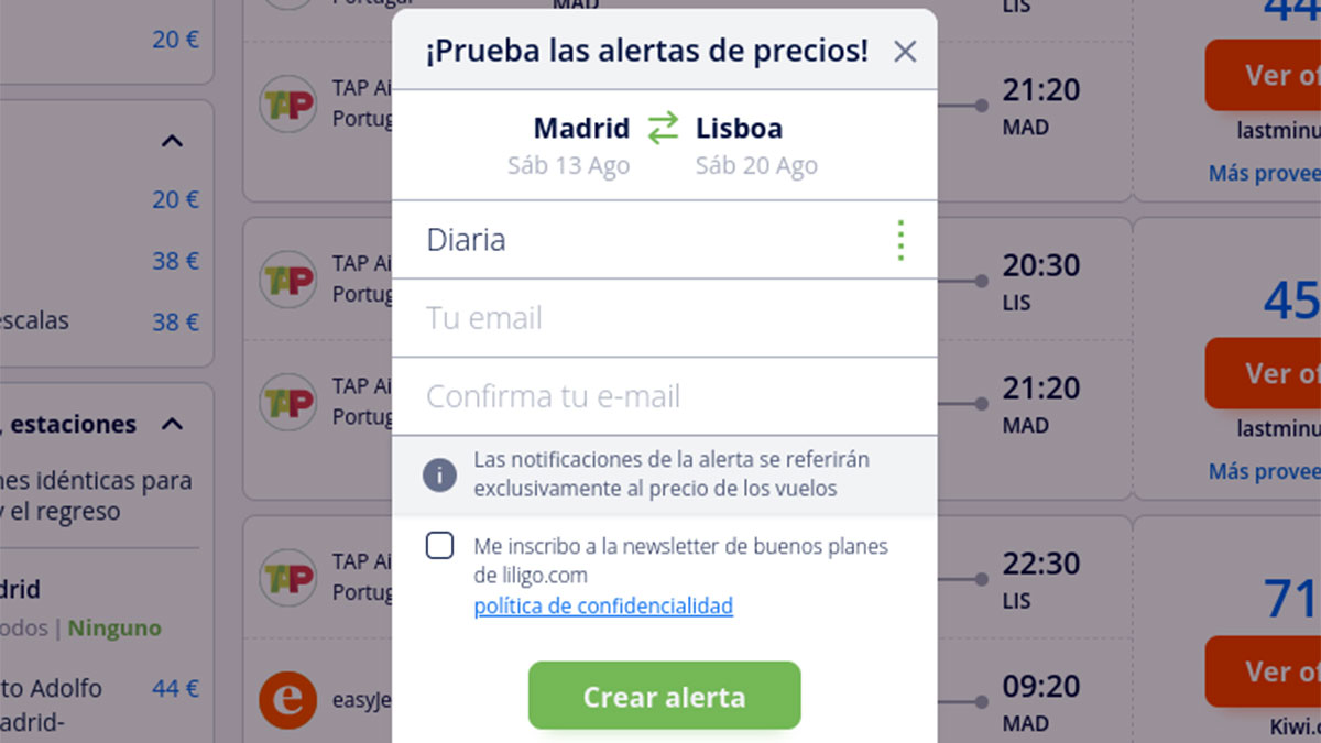 El comparador de vuelos Liligo también ofrece la posibilidad de hacer un seguimiento de precios y obtener notificaciones de forma diaria o semanal, según las preferencias. El proceso es el mismo que en el resto de páginas. Solamente tienes que introducir los criterios de búsqueda para tu vuelo y en la página donde aparecen todas las ofertas buscar la pestaña ‘Alerta precios’. Es un botón que se encuentra en la parte superior izquierda de la pantalla y es de color verde.