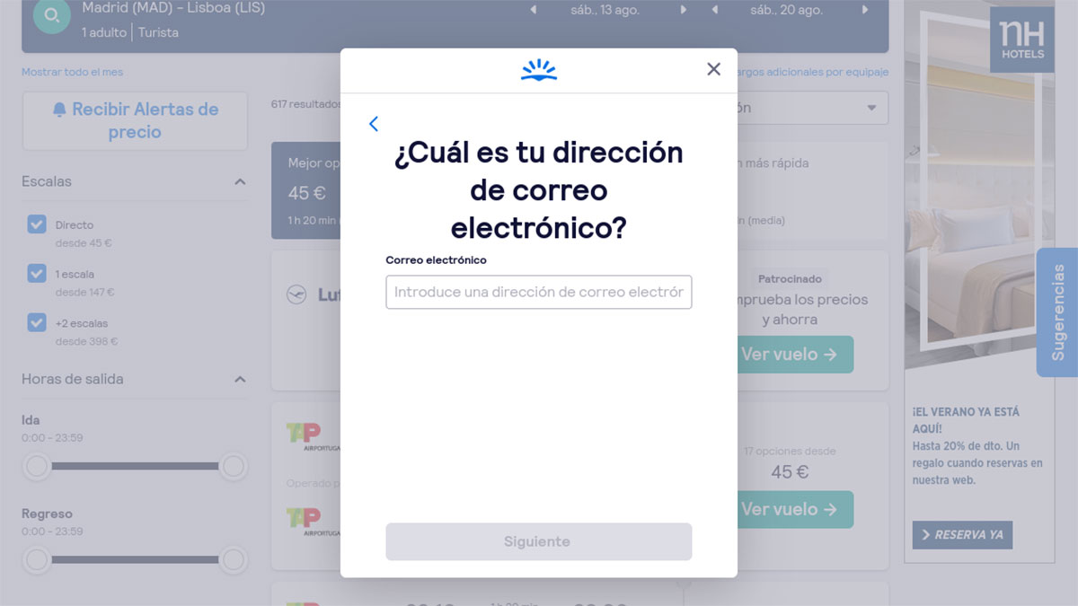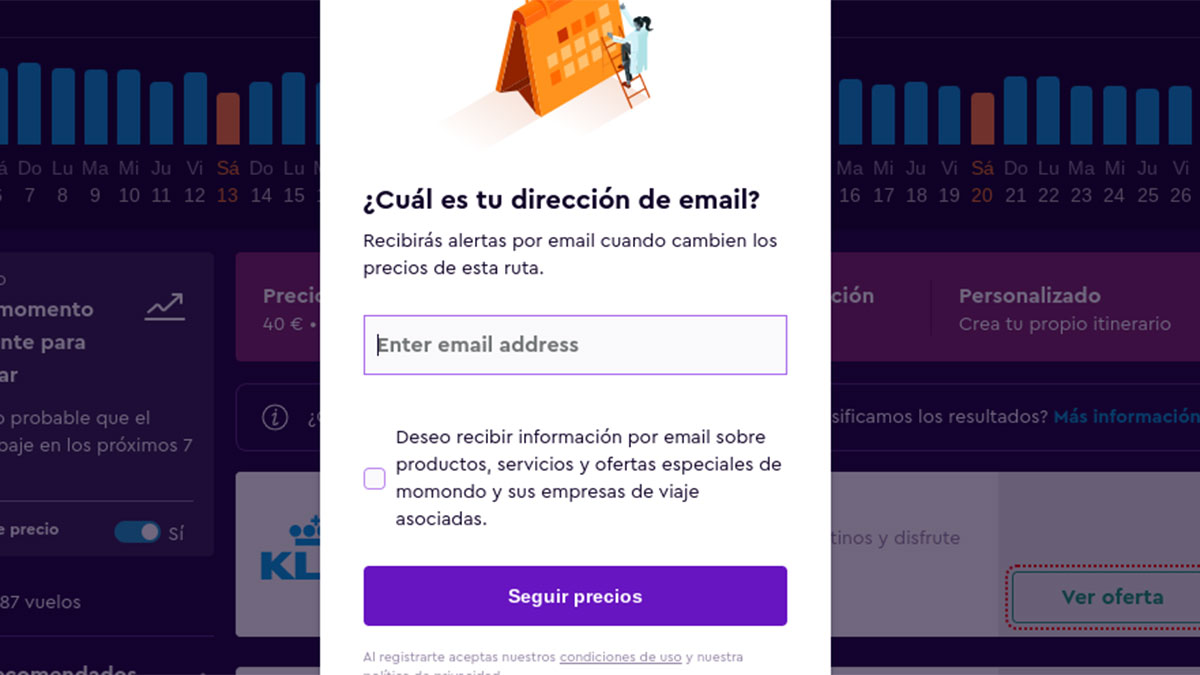 En Momondo también puedes activar esta función de alertas. En este caso, solamente tienes que introducir una dirección de correo electrónico para que te lleguen estos avisos al correo. Para activar la función pulsa el botón ‘Alerta de precio’ de la parte izquierda de la pantalla.