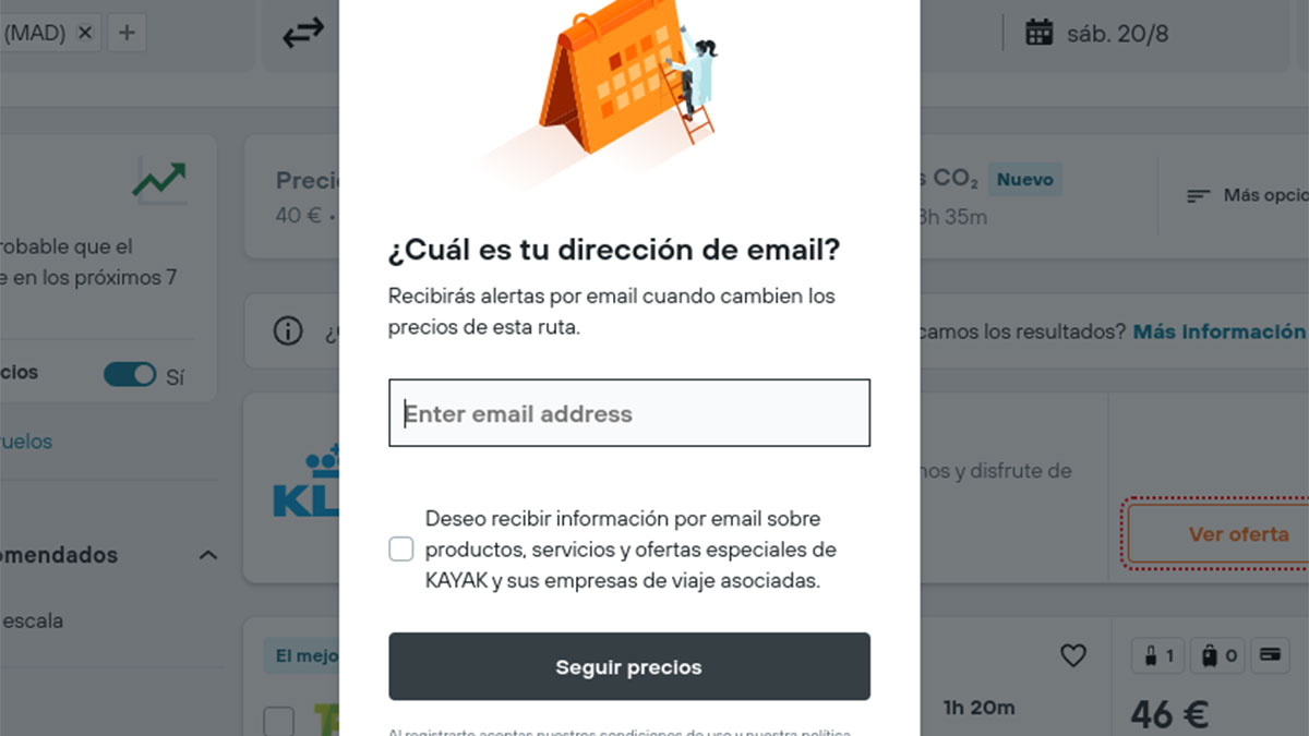 Kayak es otra de las plataformas de vuelo en la que puedes activar el sistema de alertas. Al igual que en las otras web, en este caso también tienes que crear una cuenta o iniciar una sesión con el usuario para estar al tanto de los cambios de precio. Puedes iniciar tu búsqueda del billete específico que quieres comprar y buscar a continuación la pestaña ‘Seguir precios’ que se encuentra en la parte superior izquierda.
