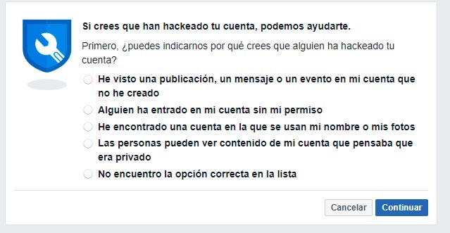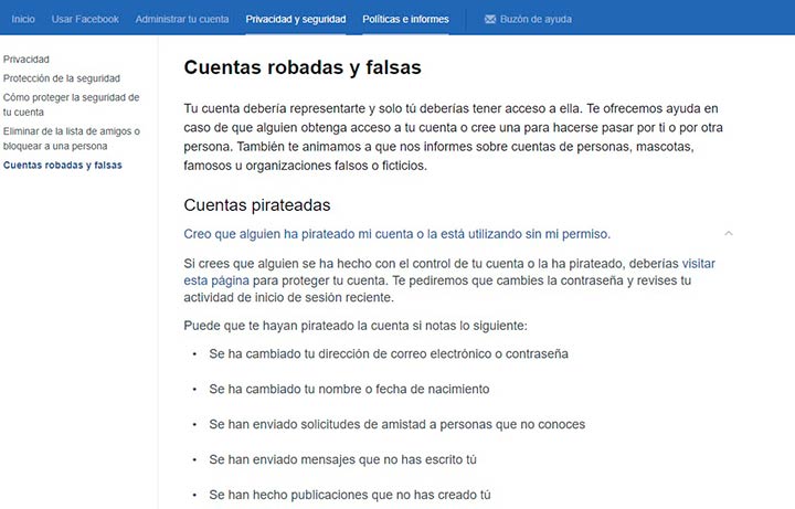 En esta sección, Facebook ofrece información sobre cómo detectar una suplantación de identidad y qué hacer si te hackean el Facebook.