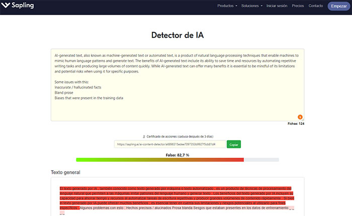 Esta herramienta funciona de una forma muy sencilla: no es necesario establecer ningún prompt, solo tienes que copiar el texto en un recuadro y verás el porcentaje de texto ‘falso’ generado por la IA. Además, aparecerá en rojo las frases exactas originadas por IA y los motivos por lo que se trata de un texto que no ha sido creado por un humano.