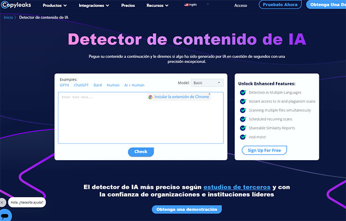 Esta herramienta es una extensión de Google Chrome. Ofrece una versión de prueba para comprobar un texto de hasta 250 palabras. Es capaz de identificar si ha sido creado por la IA de ChatGPT, GPT4, Bard (Gemini) o por un humano o una mezcla de humano e IA.
