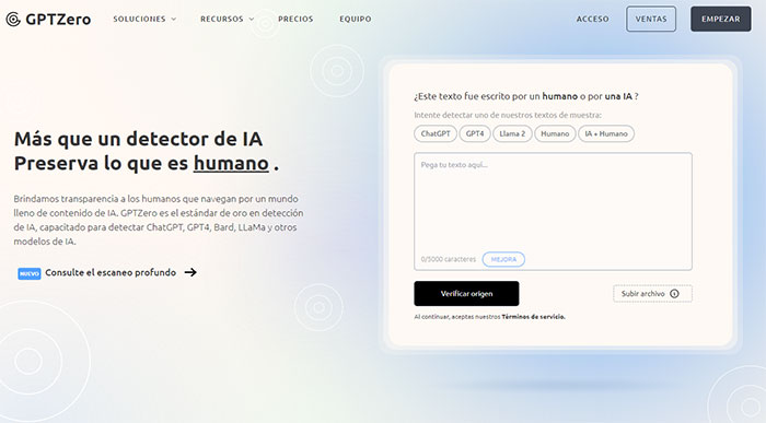 GPTZero es una de las herramientas más utilizadas para detectar si un texto ha sido generado por inteligencia artificial. Es capaz de detectar la forma de redactar que tiene ChatGPT, GPT4, Llama 2 de Meta, un humano o una mezcla de IA y humano.