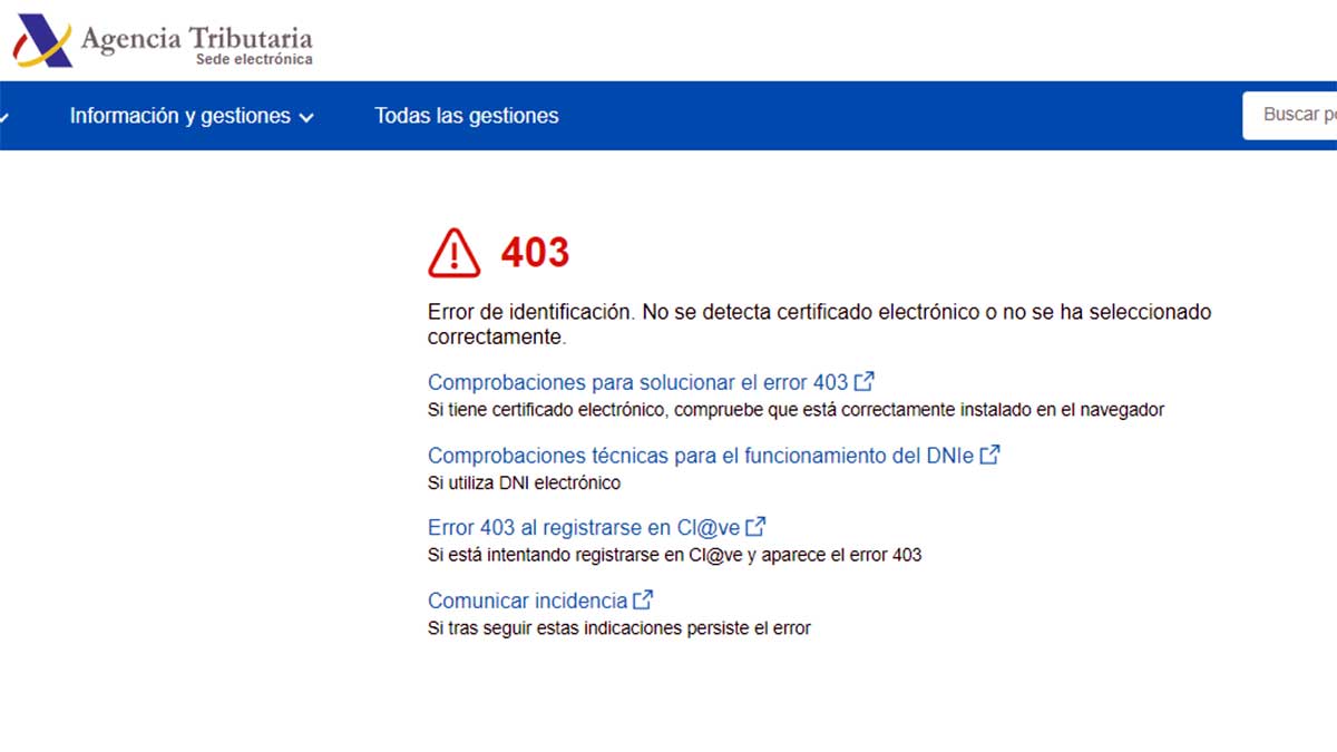 Al pulsar en este enlace, pueden pasar dos cosas. Si no tienes ninguna firma digital instalada en el ordenador, aparece un mensaje como el que ves en la siguiente imagen: