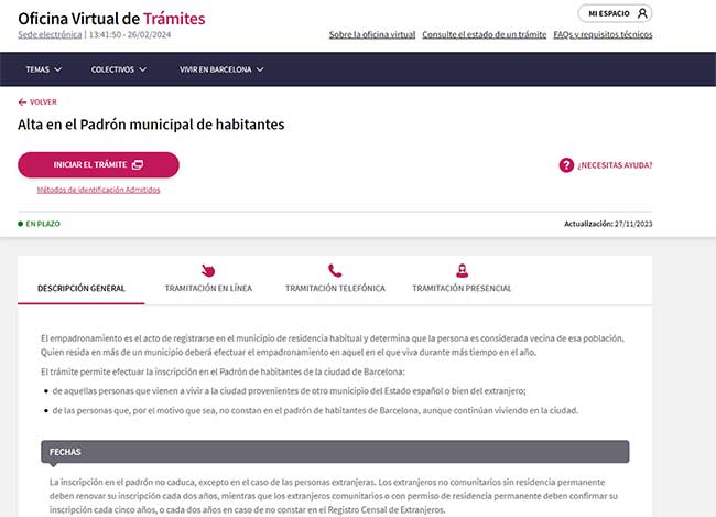 El procedimiento para empadronarse en Barcelona es más sencillo si lo haces por internet. Solo tienes que acceder a la sede electrónica del Ayuntamiento de Barcelona y pinchar en ‘Iniciar el Trámite’.
