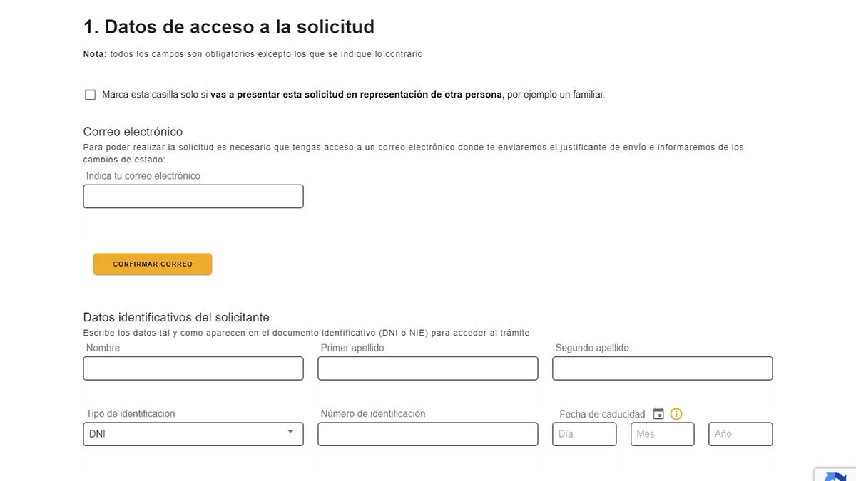 A continuación se abre un formulario online como el que ves en la siguiente imagen en el que tienes que completar los datos personales de acceso a tu solicitud y completar uno de los pasos nuevos de verificación de identidad.