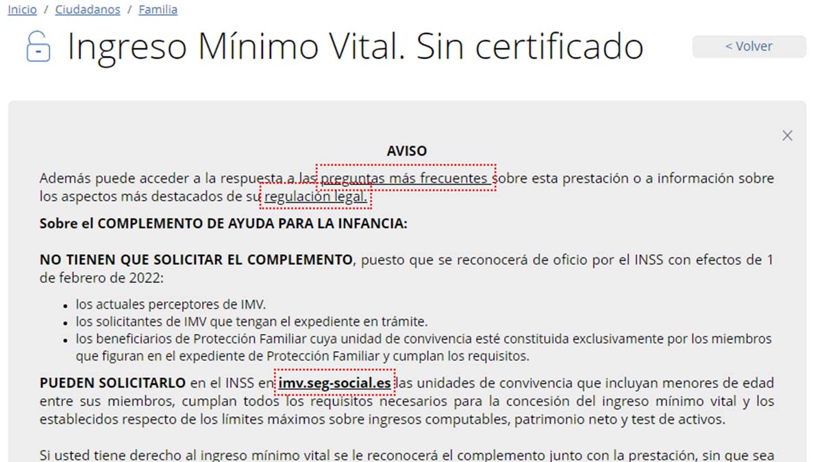 Los pasos para solicitar el Ingreso Mínimo Vital son muy sencillos. Pueden pedir esta ayuda por internet tanto las personas con identificación digital como sin ella. Si no tienes firma digital, tienes que seleccionar el primer enlace de la pantalla que dice ‘Ingreso Mínimo Vital. Sin Certificado’.
