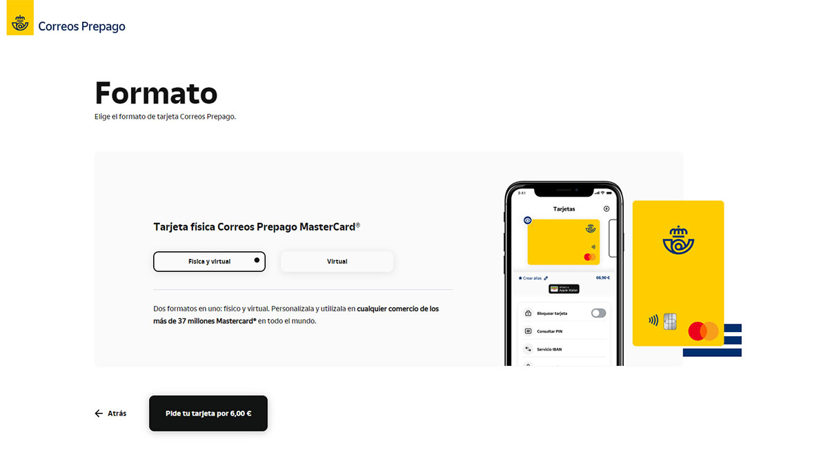 En la siguiente pantalla hay que seleccionar si quieres la tarjeta en formato físico o si quieres tener una tarjeta prepago virtual y en formato físico. Tras seleccionar una de las dos opciones, pulsa el botón negro del final de la pantalla que dice ‘Pide tu tarjeta por 6 euros’.