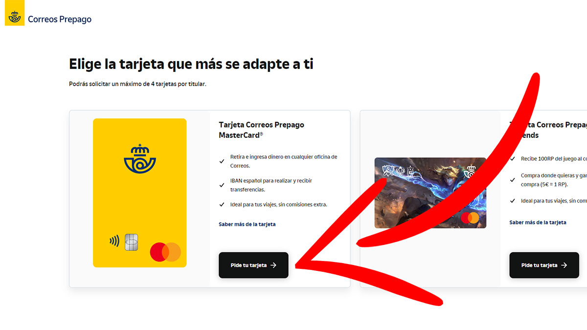 En la siguiente pantalla aparecen dos opciones. Para conseguir la tarjeta prepago, hay que seleccionar el bloque de la izquierda de la pantalla que dice ‘Tarjeta Correos Prepago Mastercard‘ y pulsar el botón negro de ‘Pide tu tarjeta’.