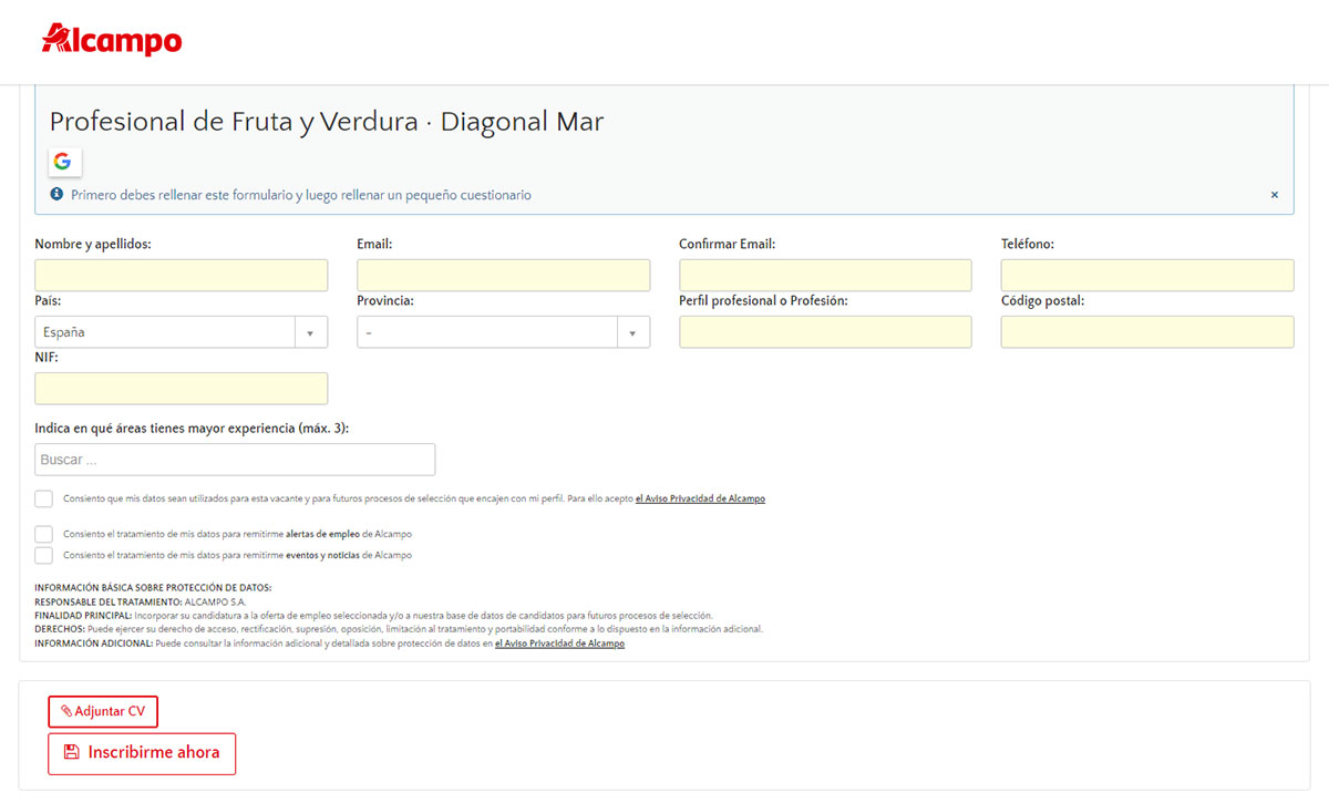 Una vez tengas esta página con todos los datos rellenados, pincha en el botón ‘Inscribirme ahora’ y accederás a otra página en la que tienes que contestar a un pequeño cuestionario. Una vez hecho esto, ya estás inscrito. Si quieres ver todas las ofertas disponibles en Alcampo, puedes hacerlo directamente desde el portal de empleo de Alcampo.