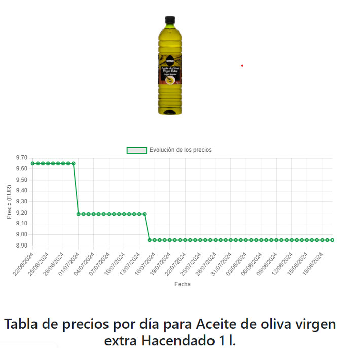 Si, por ejemplo, prefieres buscar el precio del aceite de oliva en Mercadona y su evolución histórica, deberás pinchar en el logo del supermercado y seleccionar el producto. A continuación, podrás comparar el precio del aceite de oliva de cada marca, filtrar por el tipo de aceite de oliva o comparar por litros.