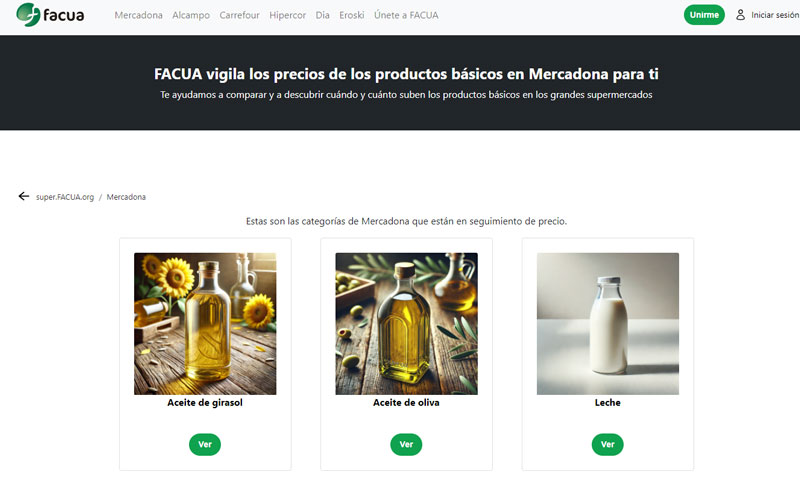 Esta asociación sin ánimo de lucro ha presentado la página web super.FACUA.org, donde los consumidores podrán consultar y conocer las oscilaciones históricas del precio en el aceite de oliva, el aceite de girasol y la leche. De este modo es más fácil comparar los precios entre supermercados y saber cuál es el mejor día de la semana para comprar los productos mencionados.