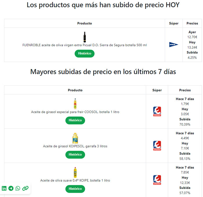 En la página principal, podrás filtrar por supermercado o consultar directamente el producto en cuestión que más ha subido de precio y en qué supermercado lo ha hecho, así como el precio que tenía ayer y el actual.