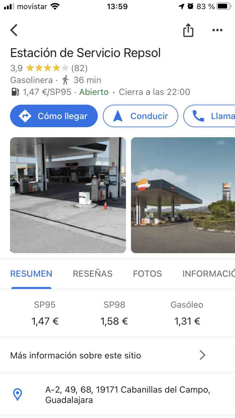 Y si quieres tener más información, puedes pulsar sobre el icono de una estación y aparecerá con detalle los precios de los distintos combustibles que ofrecen en ese establecimiento así como reseñas de clientes y la ruta para llegar a la estación.