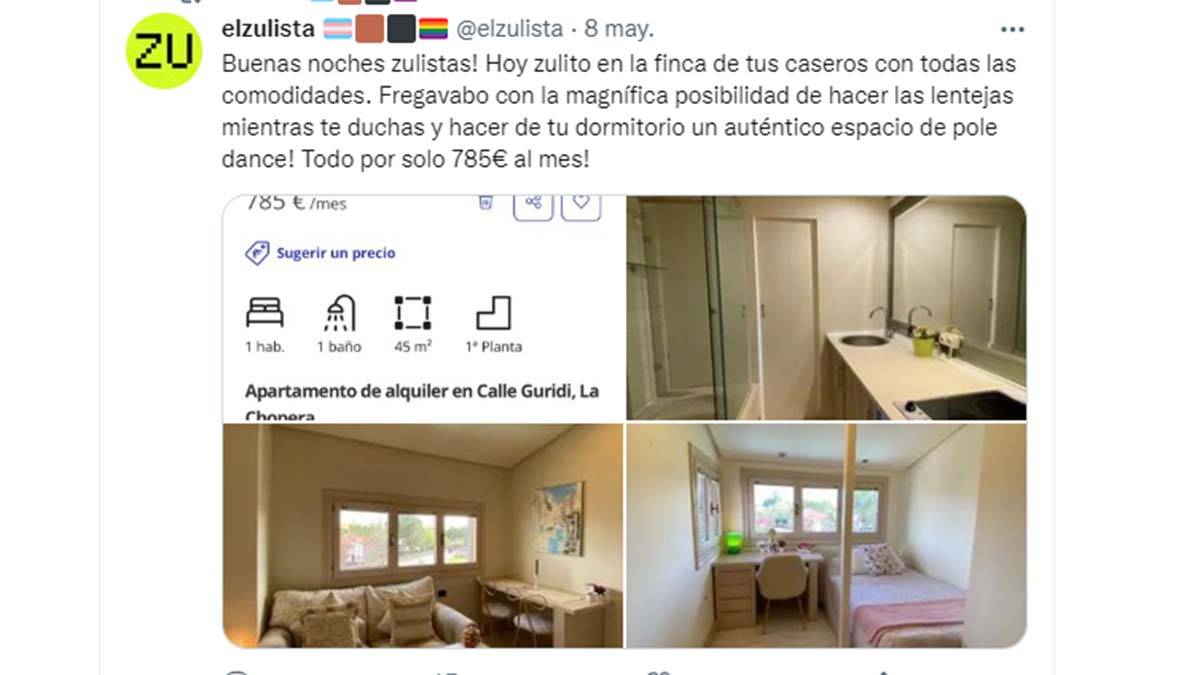 Esta es una de las últimas publicaciones del muro de Twitter de ElZulista. Un piso, por llamarlo de alguna manera, por el que piden 1.150 euros al mes de alquiler. Distribuido en 75 metros cuadrados y en ruinas. Según las descripciones de la oferta, vivienda a estrenar y en buen estado.