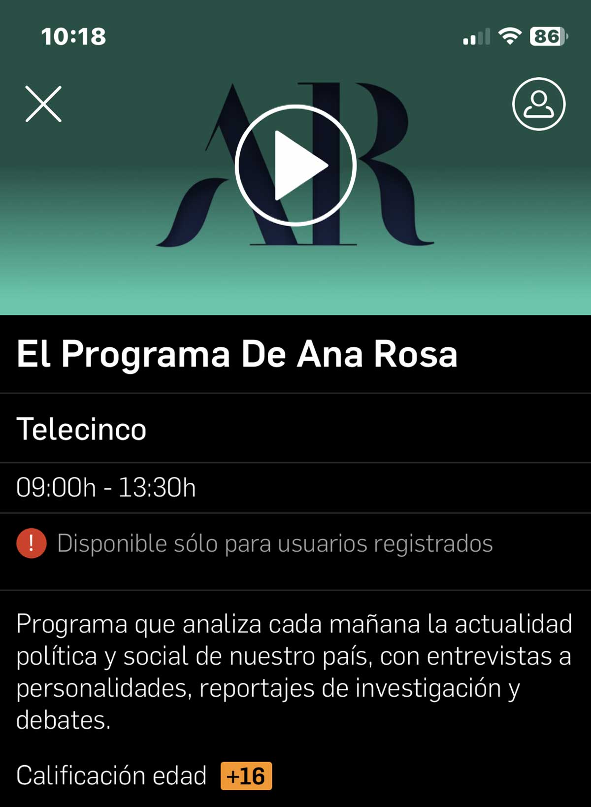 Al hacerlo, se abre una nueva pestaña con un botón de ‘Play’ y un recuadro de fondo donde se detalla el programa o contenido que se está emitiendo en ese momento. Al pulsar sobre este icono del símbolo ‘Play’, comienza la retransmisión.