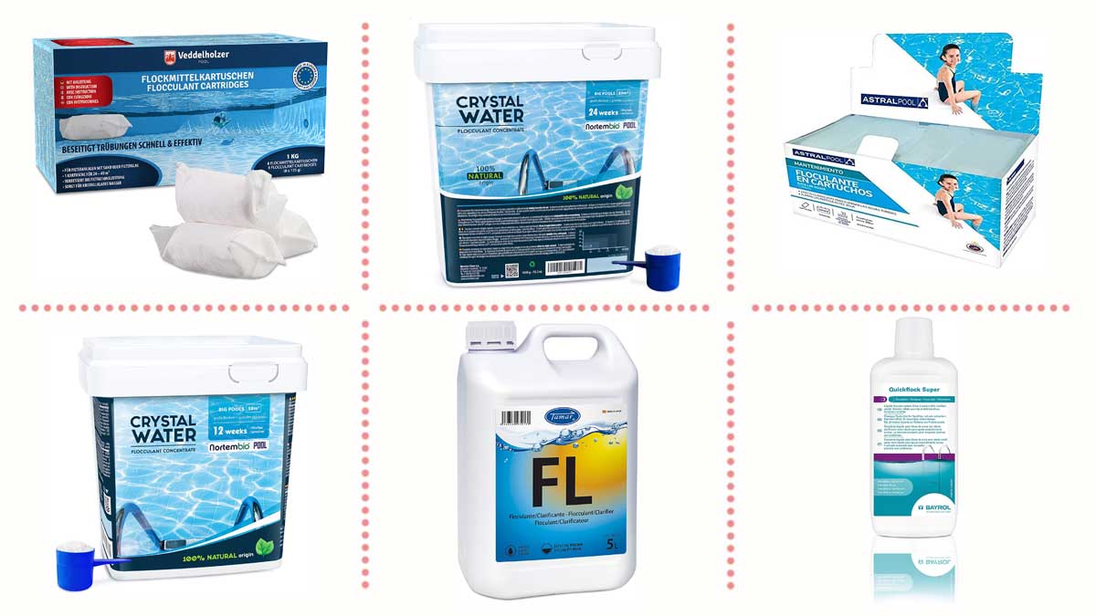 Si quieres ver otros modelos, en la siguiente tabla comparativa te dejamos una selección de los mejores floculantes para el agua de la piscina que puedes comprar con buena relación calidad-precio.